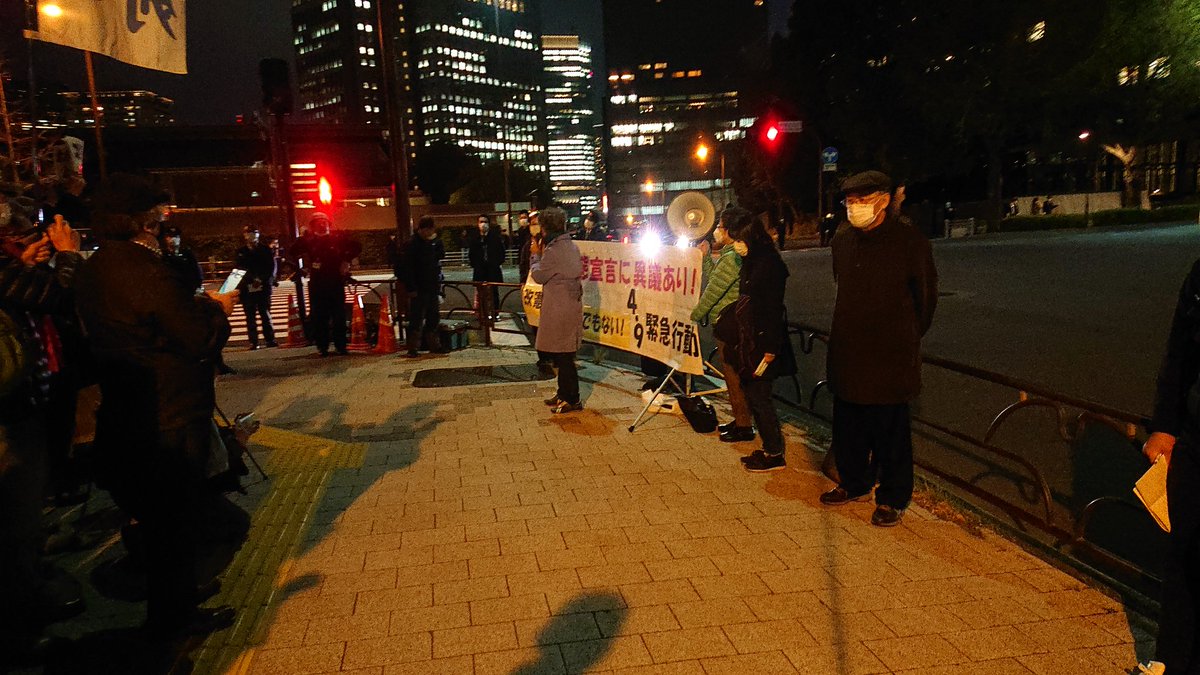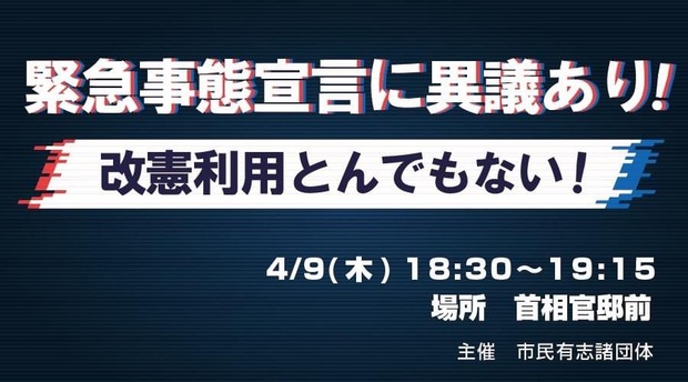 安倍晋三首相が新型コロナウイルス特措法に基づき発令した緊急事態宣言には問題が多い上、憲法改正への波及に期待する発言をしたとして、市民団体が9日、東京・永田町の首相官邸前で抗議集会を開き「緊急事態宣言に異議あり」「改憲に利用するな」と訴えた。