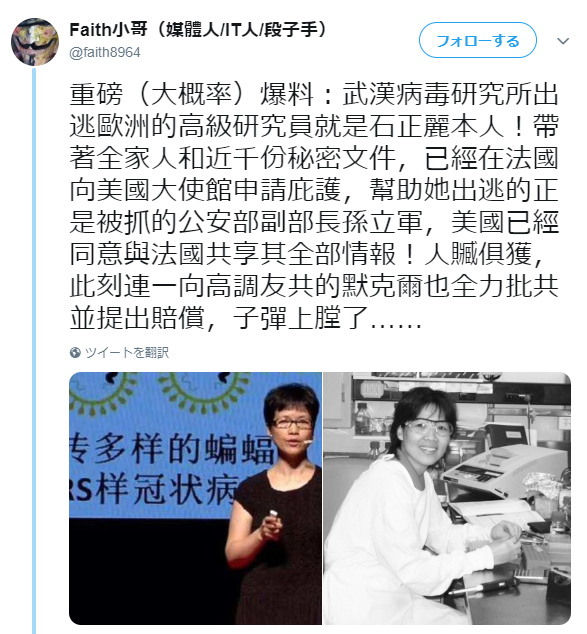 そんな中、武漢にあるウィルス研究所の研究員である石正麗(せきせいれい)が家族と共にフランスのアメリカ大使館に亡命していたことがわかった。研究員は1000近くもの極秘書類を持って保護を要請。