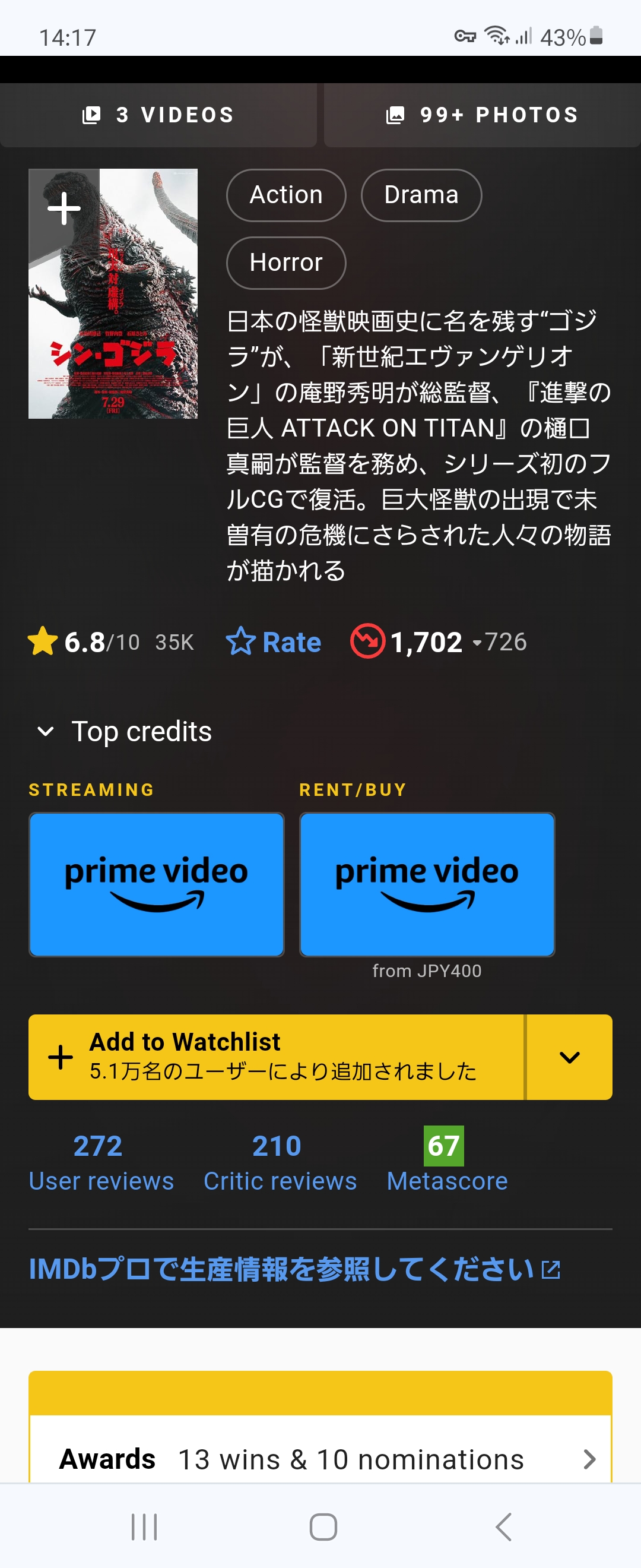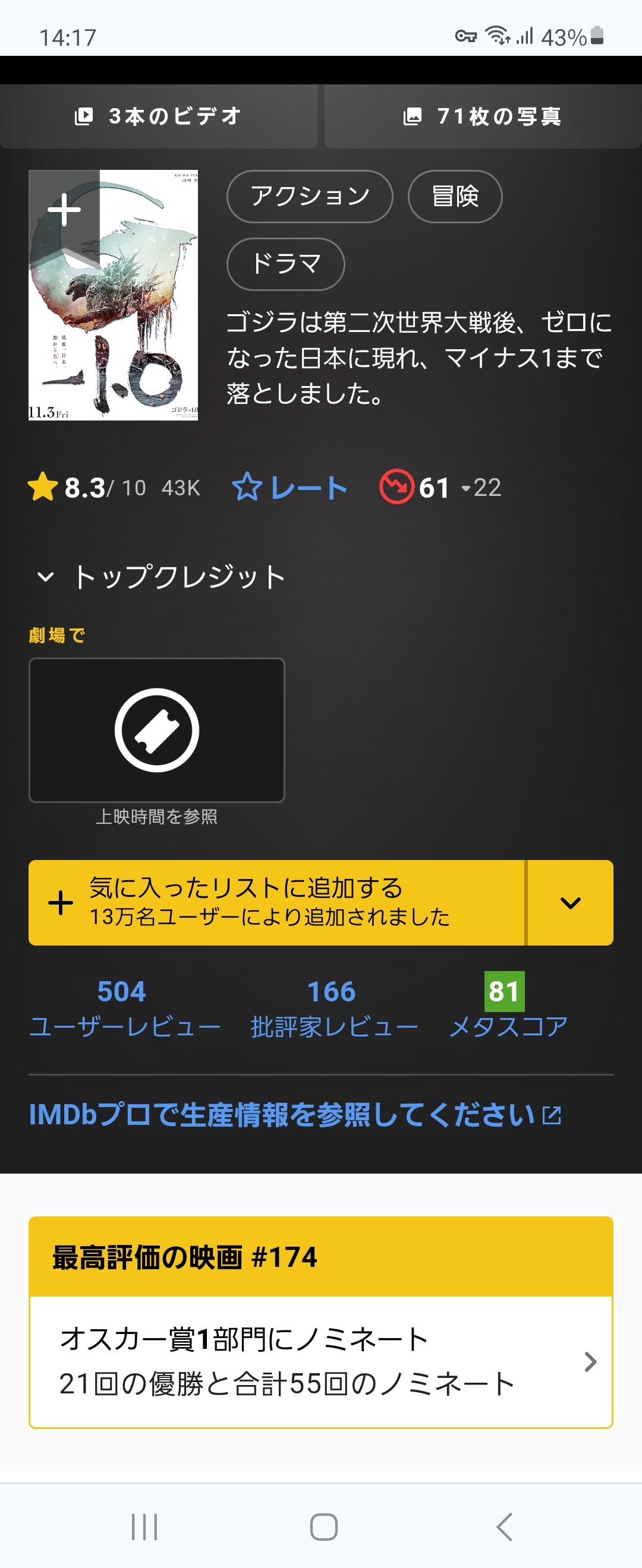 シンゴジなんて向こうじゃスコア低すぎて評価全くされてないぞ