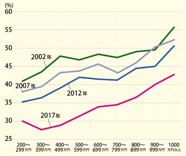 あたりまえだが高収入ほど専業主婦の割合は高い。