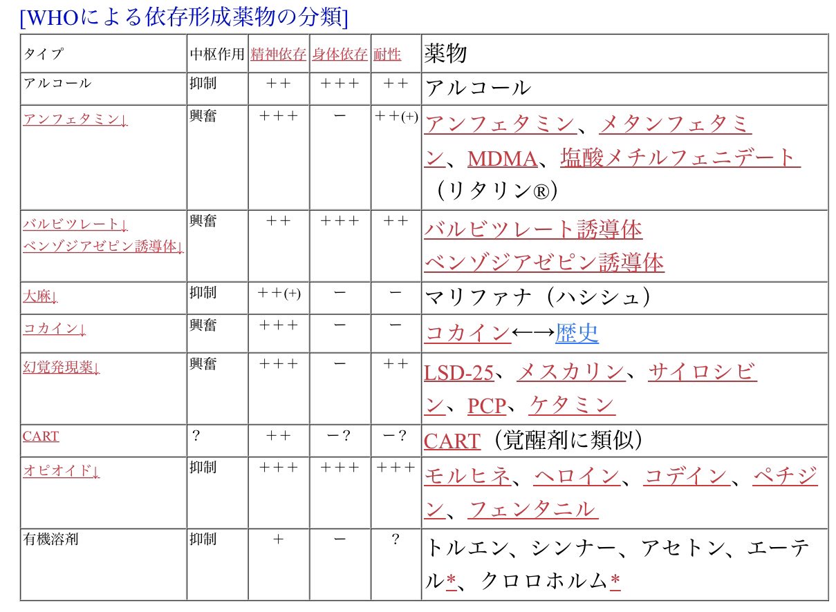コカイン、アンフェタミンは精神依存のみ。身体依存はない