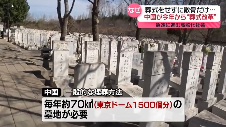 中国政府は今年、“葬式改革”として、散骨などの自然葬を国を挙げて推し進める方針を打ち出しました。その背景にあるのが、土地不足です。