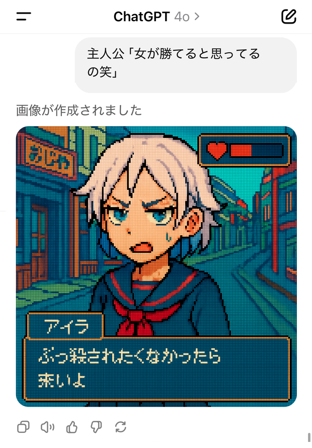 4:こちらのテキストに対して、そのキャラクターとして画像内に台詞を生成するように指示する。