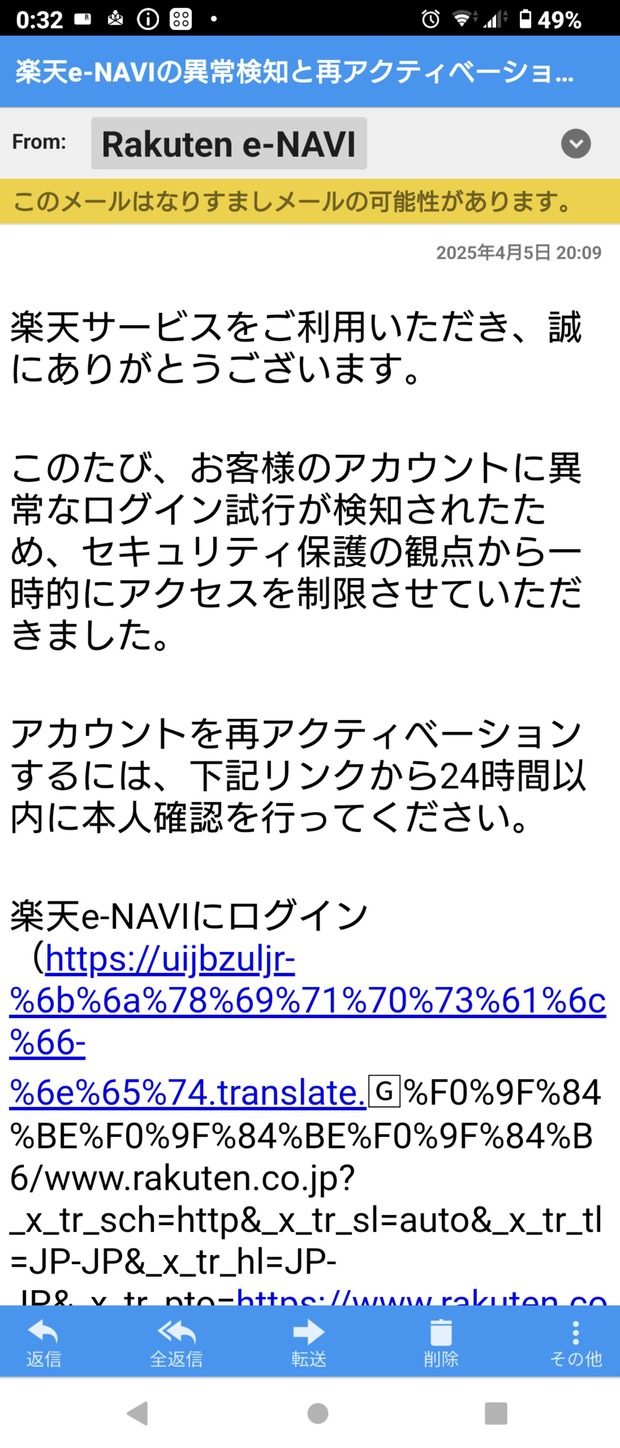 送り元のメアドが詐称されてないのが幸い。これがRakvten.comとかなら厳しい