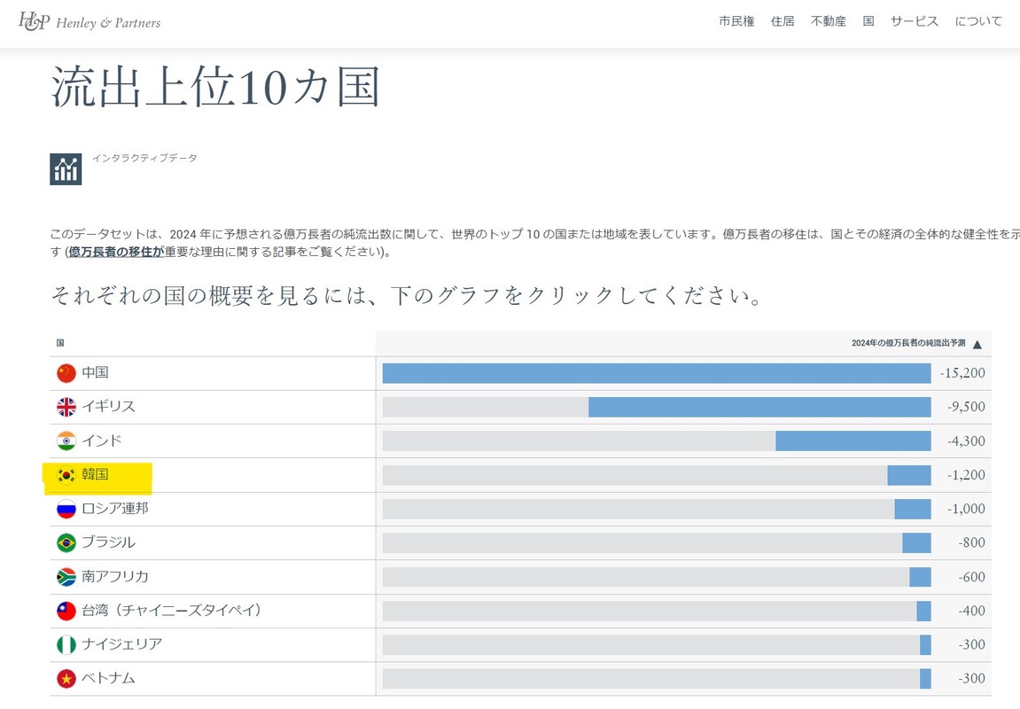 4位の韓国は、2024年に1,200人の富裕層が国外へ純移住するという記録的な数字になる。