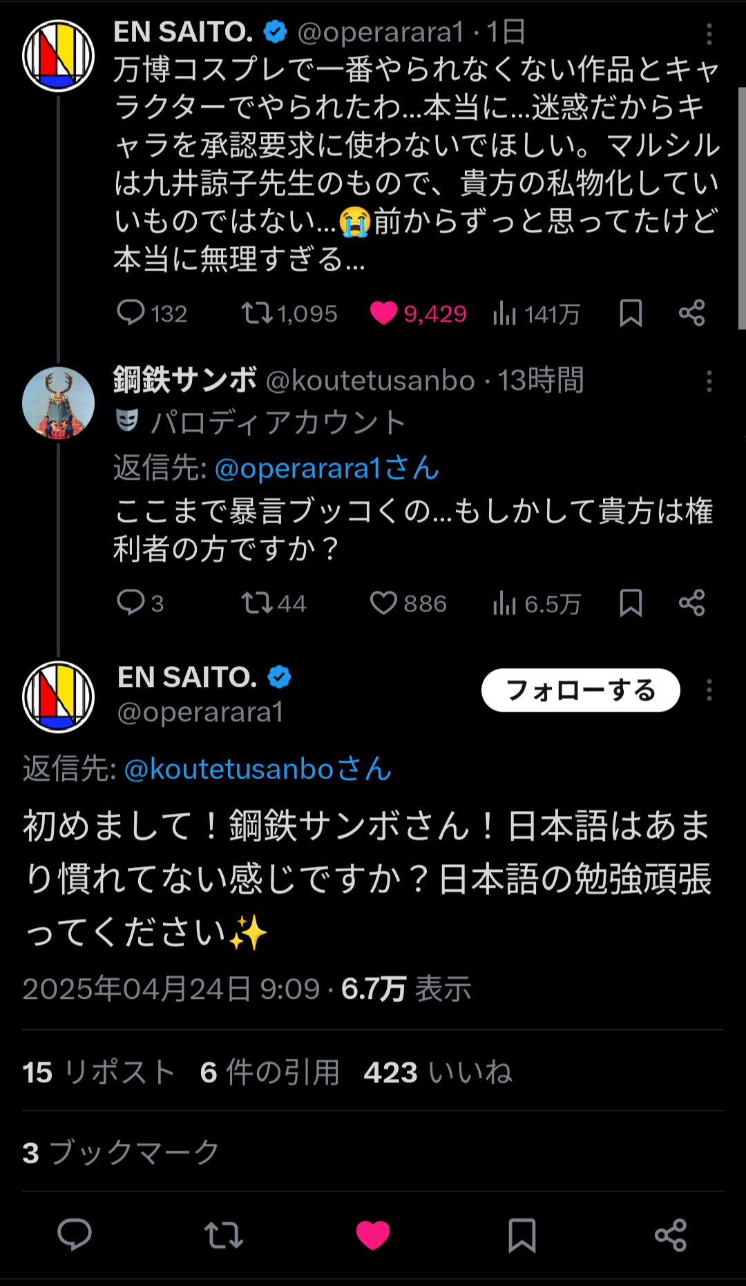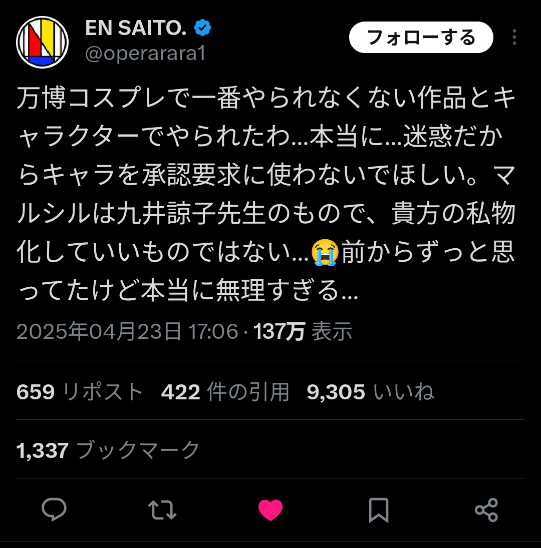 万博側はOK出してるから別にコスプレ自体は構わないと思うがこの人バズったのに味しめたのかずっとこのキャラしかやらないの?