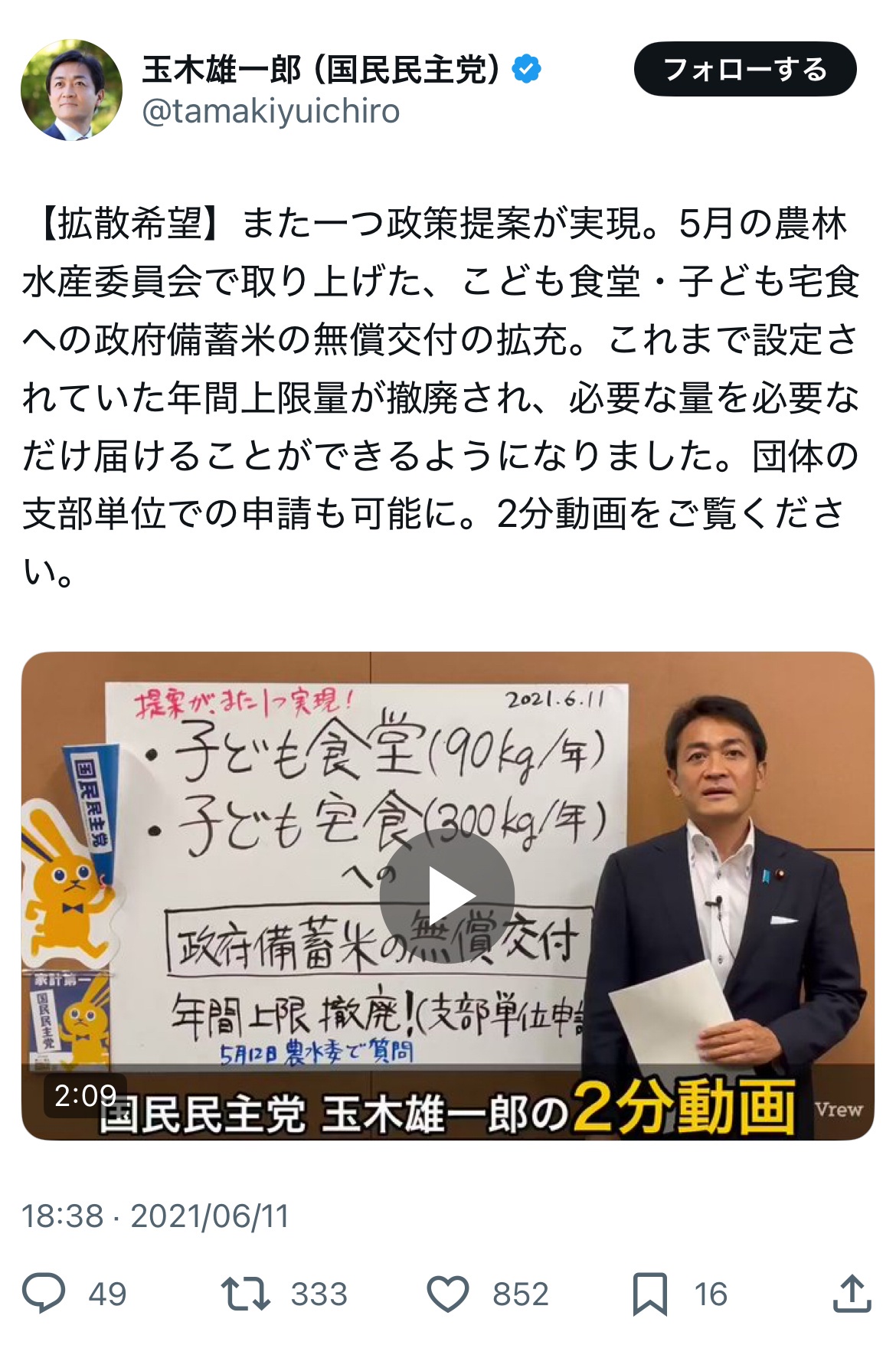 これは大賛成。お腹をすかせた恵まれない子供にせめてコメくらい頬張らせてやって欲しい。これに使う税金なら払う