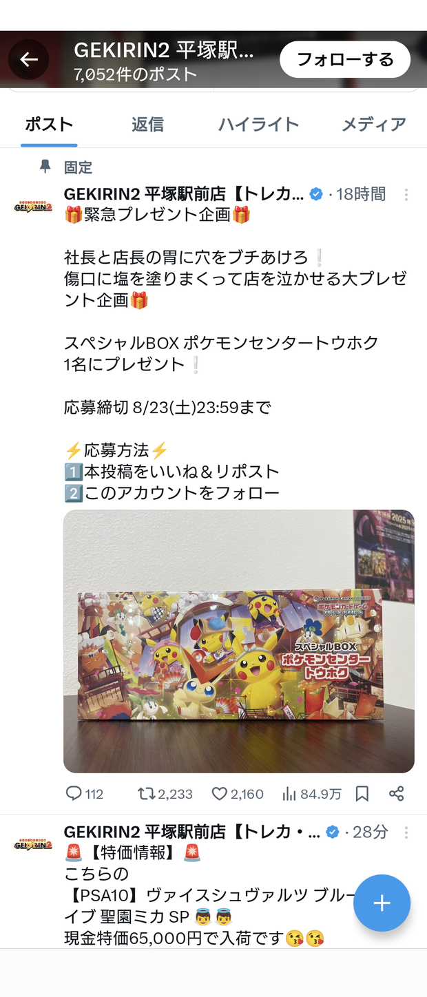 神奈川・平塚にあるホビー・トレーディングカード専門店「GEKIRIN2 平塚駅前店」の公式Xアカウントが15日、更新され、「ポケモンカード」の45万8000円のレアカードを、スタッフのミスにより4万5800円で販売してしまったとして、購入者に残金支払いを呼びかけた。17日までに表示2600万回を超える反響となっている。