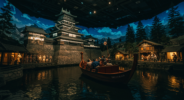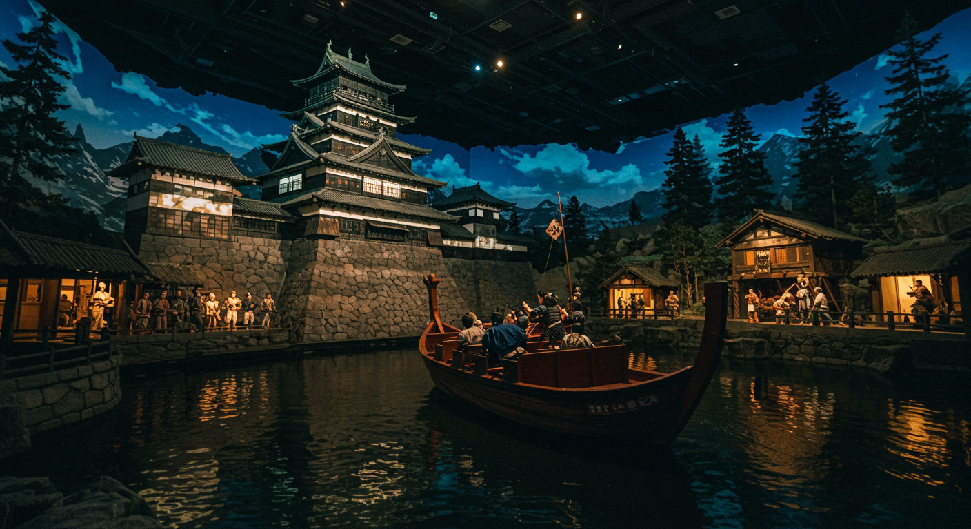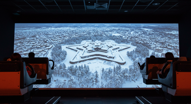下から見上げるとただの堀でしかない五稜郭。でも空から見れば・・・映像とともに動く座席に乗って縦横無尽に飛び交いましょう