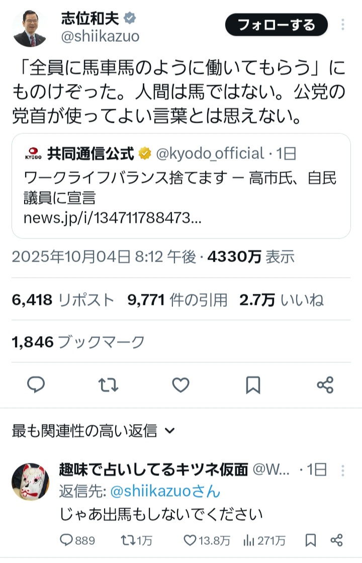 高市「馬車馬のように働いてもらいます」共産・志位「人間は馬ではない。党首が使う言葉じゃない」←ええ…?