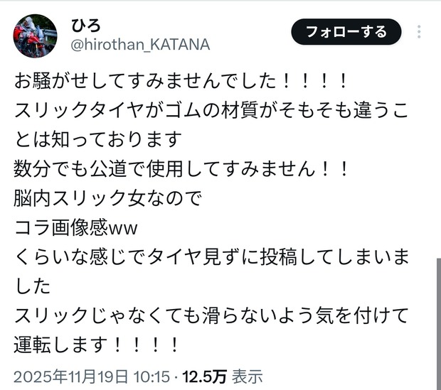 【悲報】女ライダーさん、公道で使用不可のタイヤで走行し無事燃え上がる