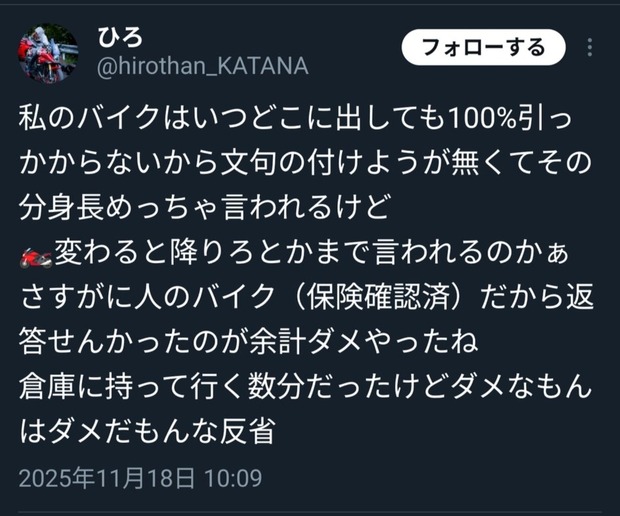 バイク用品店でタイヤアマリングなおじさん達見て鼻で笑ってそう