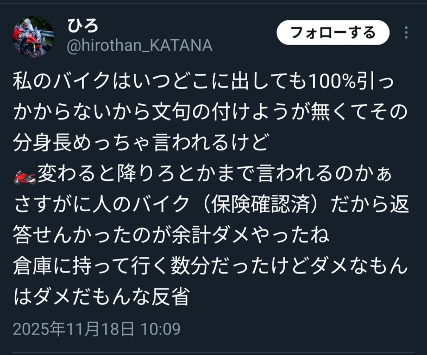 バイクが燃えたのかと思った