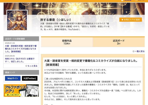 なお、本件を受けて作者は「この出来事を、決して『失った』とは思っていません。むしろ、『もっと自由に、もっと新しくなれる』。そのように、真摯に、そして前向きに捉えたいと思っています。」「ボタン一つで生まれる言葉ではなく、AIと対話し、葛藤し、『私とAIでなければ作れない』と言われるような作品」を残したいとコメントしている。