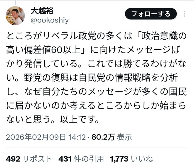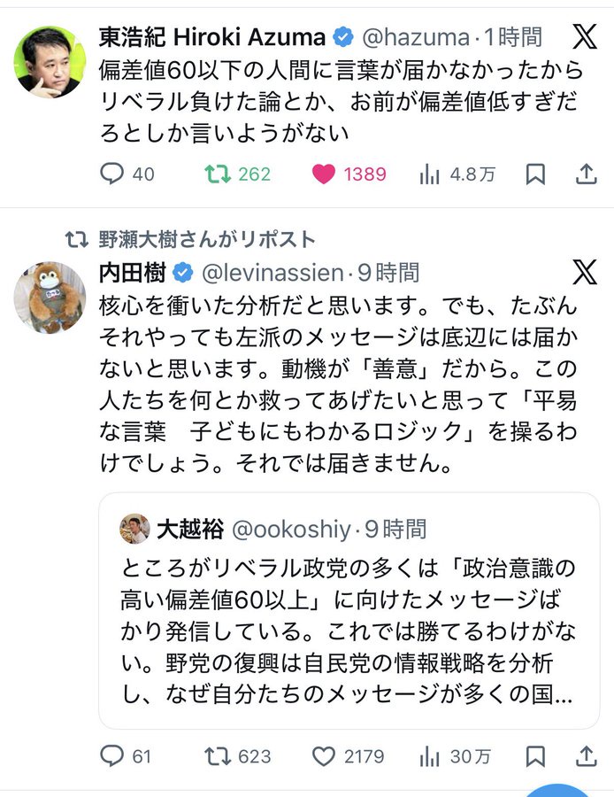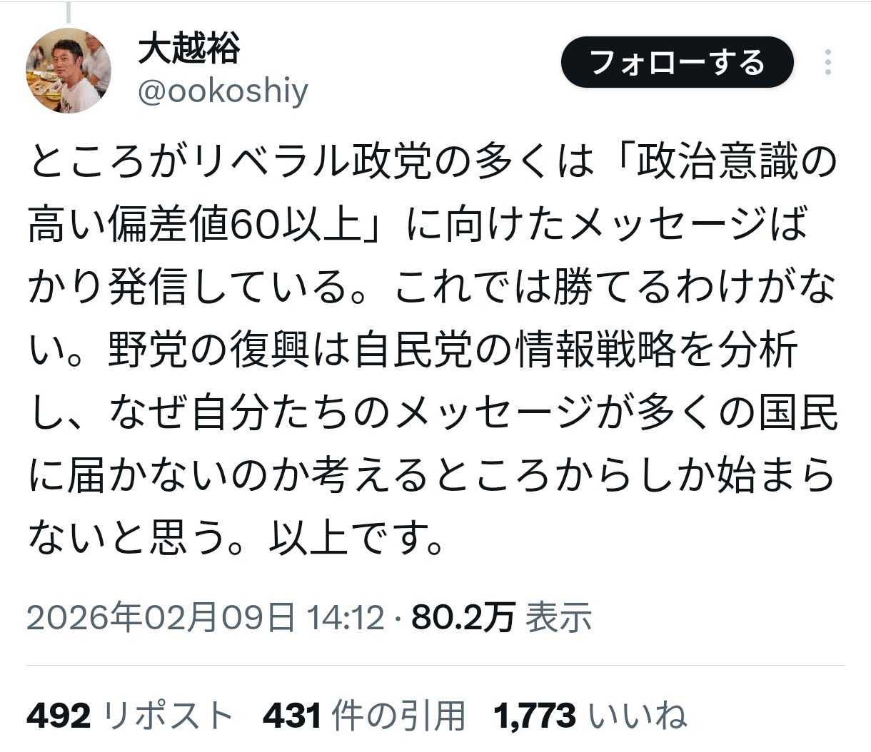 ところがリベラル政党の多くは「政治意識の高い偏差値60以上」に向けたメッセージばかり発信している。これでは勝てるわけがない。野党の復興は自民党の情報戦略を分析し、なぜ自分たちのメッセージが多くの国民に届かないのか考えるところからしか始まらないと思う。以上です。