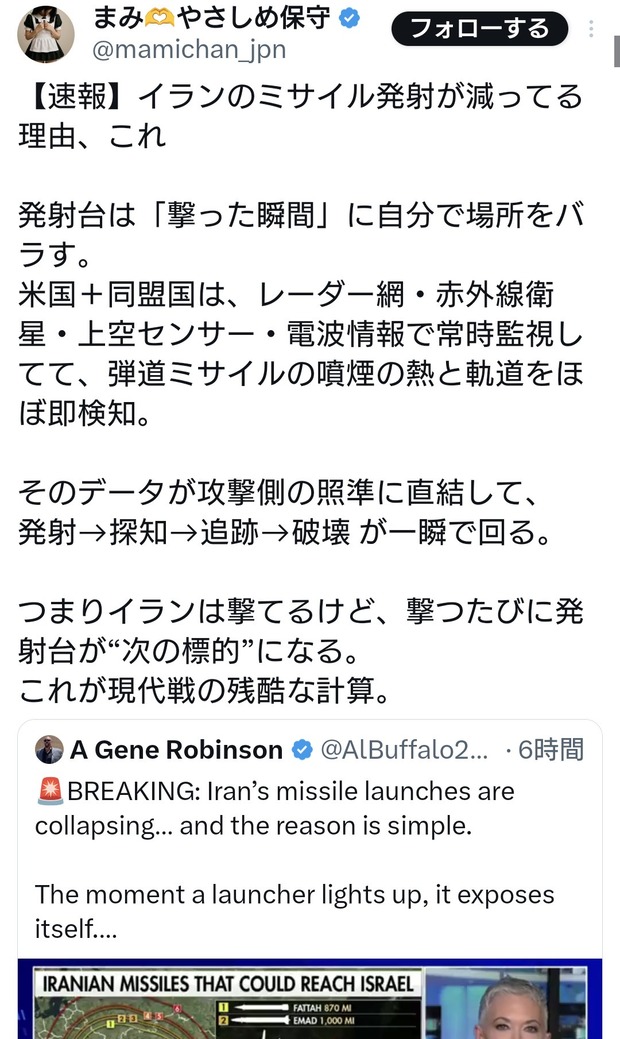 イランはミサイルを発射すればするほど自らの位置をバラすことになりそこを爆撃されてる