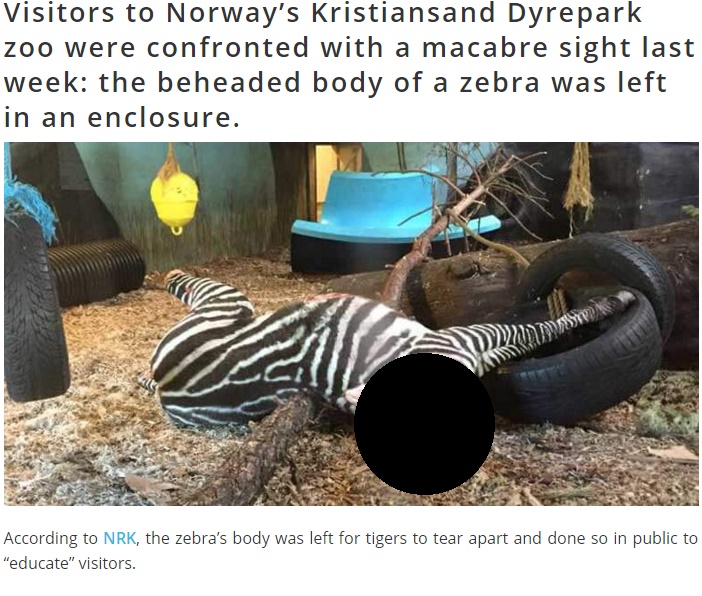 飼育員が行ったシマウマの斬首をある見学者が偶然にも撮影してFacebookに投稿し、子供たちも凍り付いた表情でそれを見守っていたことから波紋が広がった。