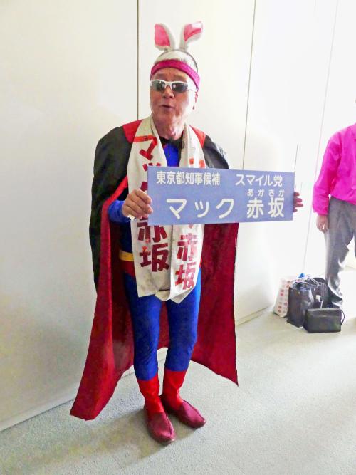 2014年の都知事選で落選したスマイル党総裁・マック赤坂氏(67)が11日、公用車での別荘通いや高額海外出張費が問題視されている東京都の舛添要一知事(67)に辞任を迫るため、スーパーマンのコスチュームを着用して知事室への乱入を試みた。