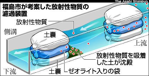 環境省はガイドラインで屋根などの除染について「できる限り排水の回収を行う」と規定。同市についてはガイドラインとは別に、放射性セシウムを吸着するとされるゼオライト入りの袋と土嚢(どのう)を側溝に積んで濾過(ろか)する方法も認めているが、これまでほとんど実施されていない。